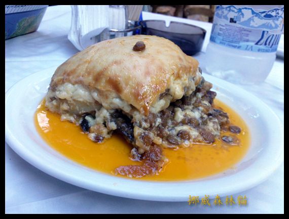 來到希臘就要吃希臘菜,這家餐廳剛好有素食的Moussaka,菜端來時,我還問了一下服務生,這真的是素的嗎?是的,是素的。這一盤Moussaka的底是馬鈴薯,中間那一層是忘了名字的豆,上層則是烤過的起司。第一次吃到這道菜,實在不知道要怎麼評價,現在回想起來,則懷念那時的滋味。