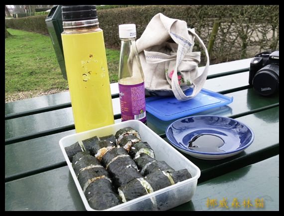 我們兩人坐在運河旁,吹著冷風,發著抖,然後吃著他親手做的壽司。幸好,我這回從台灣帶了強力保溫壺,裡頭裝著熱茶,否則我們大概冷到站不起來了。